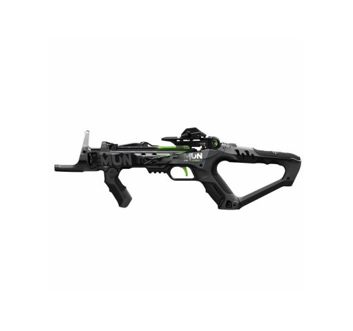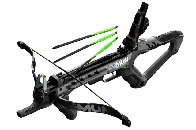 La Barnett Demun™ Tri Strike ha un design brevettato per contenere 3 frecce e caricarle automaticamente basculando il "calcio". La Demun è una pistola balestra ultra compatta con arco ricurvo che sviluppa una velocità del dardo di 180 p/s (60 m/s) é dotata di serie di mirino bicolore in fibra ottica a tre dot e 5 frecce Demun™ Hyperbolts da 7" (18 cm). Utilizzare solo ed esclusivamente le frecce proprietarie IBB109