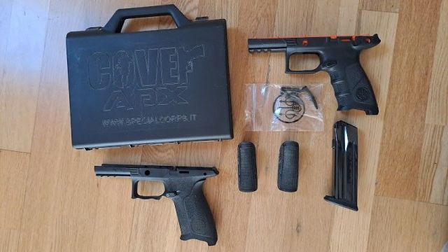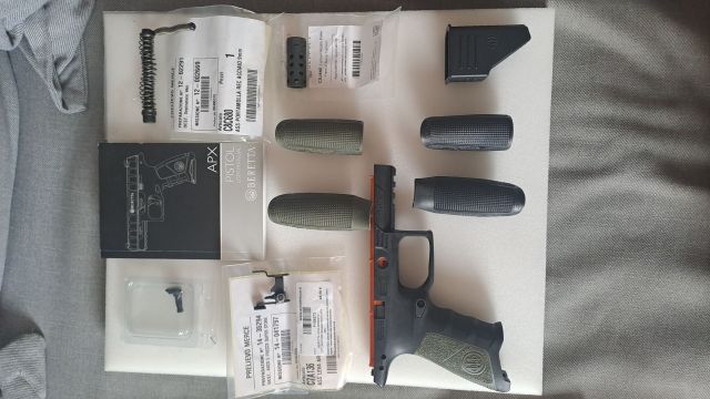 Cedo Beretta APX Combat calibro 9x21, con Freno di bocca Typhoon + originale, leva di arresto maggiorata + originale, sgancio caricatore maggiorato + originale, Portamolla acciaio + originale, molla sportiva + originale, fusto verde + fusto con sicura + fusto specialcorps + fusto originale, 3 caricatori da 17, valigetta originale, carichino e libretto.