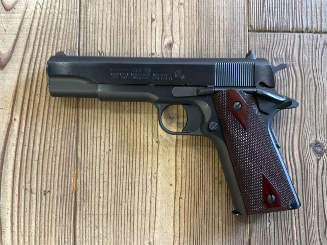 Pistola semiautomatica Colt 1911 cal. 45 acp serie 80 anno 2003 fornita da 2 caricatori da 7 colpi, guancette in legno, è una pistola semiautomatica ad azione singola, progettata da John Browning per le cartucce .45 ACP. Arma classificata comune ... condizioni ottime.