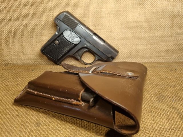 PISTOLA CAL. 6,35 BR, SOLO SA, 7RD, SICURA MANUALE E ALL'IMPUGNATURA, MECCANICA OTTIMA, BRUNITURA BUONA, CANNA DISCRETA, IN FONDINA D'EPOCA CON CARICATORE SCORTA. - codice 5732