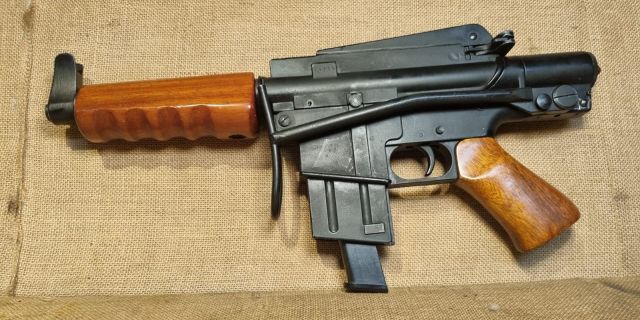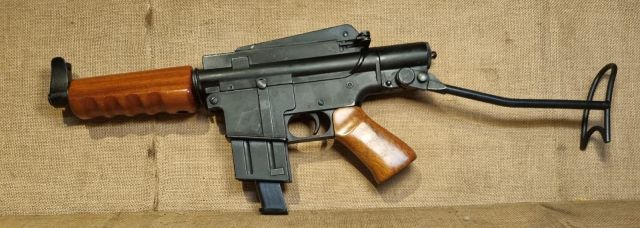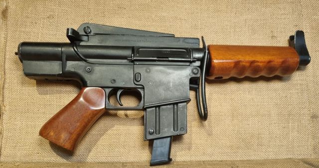 PISTOLA SEMIAUTO CAL, 7,65 BR, 1978, CASTELLO LEGA, MIRE REGOLABILI CON DIOTTRA A DUE POSIZIONI, CALCIO PIEGHEVOLE, 10RD. SCALA RIDOTTA DELL'OLYMPIC STUBBY. VERSIONE CORTA SENZA MANIGLIONE CON IMPUGNATURA E ASTA IN LEGNO. SEMINUOVA. ARMA COMUNE NON SPORTIVA.