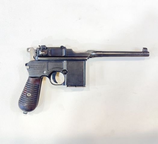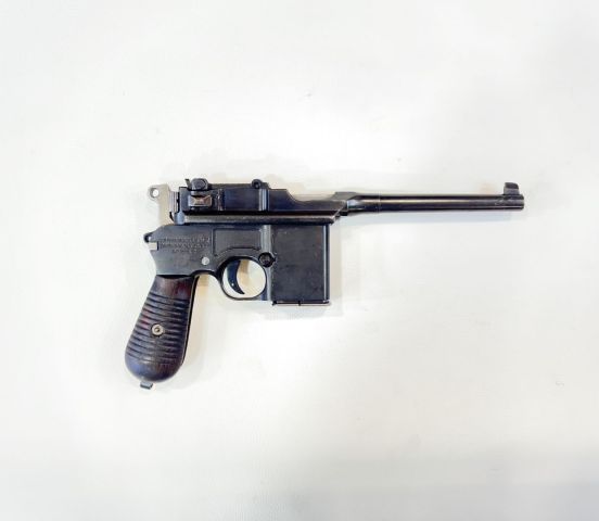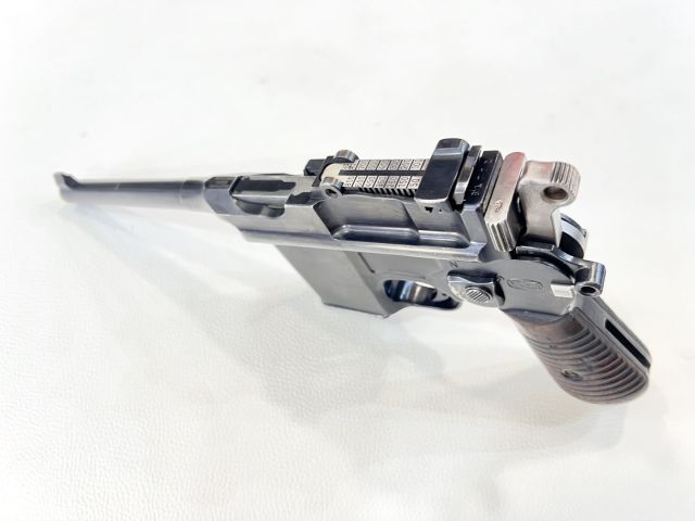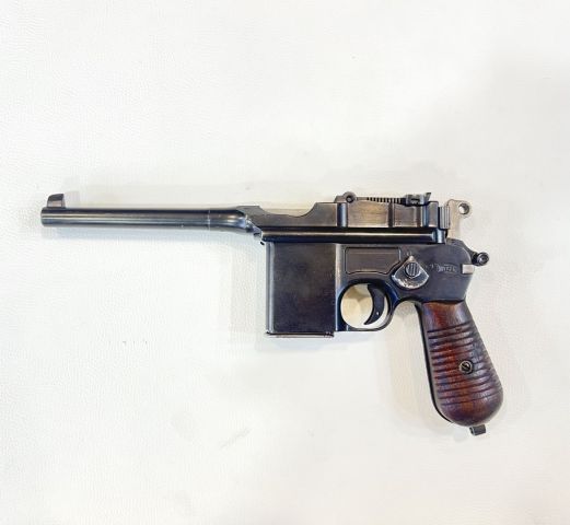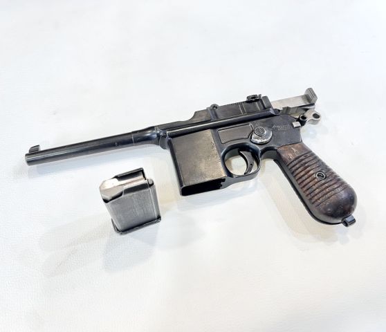 L’arma con canna da 5,5 pollici, tacca di mira posteriore graduata da 50 a 1.000 metri e l’attacco per un calciolo/fondina in legno. Si distingue dalla C96 standard per il caricatore rimovibile e il selettore di fuoco sul lato sinistro del telaio, segnato con “N” (Normalfeuer, fuoco singolo) e “Reihenfeuer” (raffica). In modalità completamente automatica la cadenza è di circa 900 colpi al minuto, rendendola difficile da controllare senza il calciolo. L’esemplare descritto è in ottime condizioni di canna, meccanica e funzionamento ed è un autentico pezzo da collezione, classificato per uso sportivo (24_00010ds1).