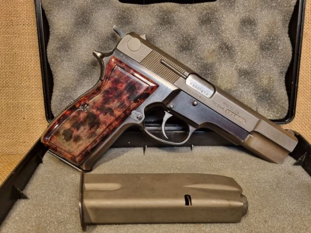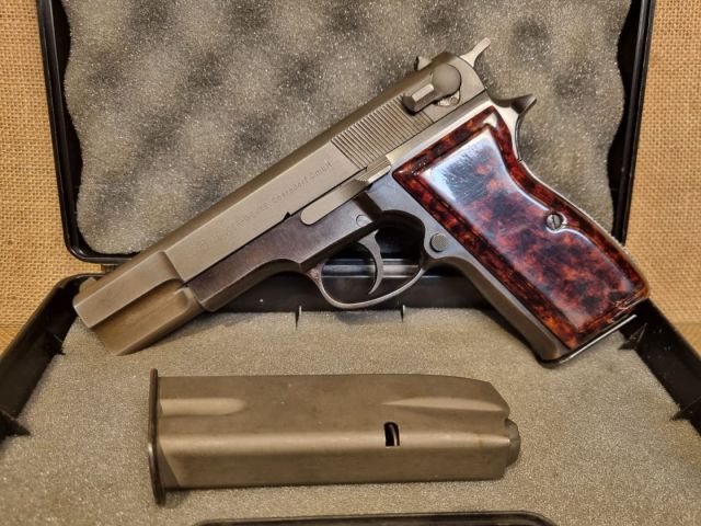 PISTOLA CAL. 9X21, 15RD, TUTTA IN ACCIAO, SA E DA CON SICURA ABBATTICANE, GUANCETTE LEGNO, CARRELLO FOSFATATO E FUSTO BRUNITO LICIDO, MECCANICA DERIVATA DA FN HP35, IN OTTIME CONDIZIONI CON CARICATORE SCORTA.
