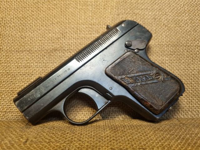 PISTOLA CAL, 7,65 BR, PRODOTTA IN BELGIO INIZI 900, UNA DELLE PRIME PICCOLE PISTOLE IN 7,65 BR, DIMENSIONI DA 6,35, ASSE CANNA BASSISSIMO CON MOLLA RECUPERO SOPRA LA CANNA PER MEGLIO GESTIRE IL RINCULO, 6 RD, MECCANICAMENTE IN ORDINE, RIBRUNITA, GUANCETTE VISSUTE.