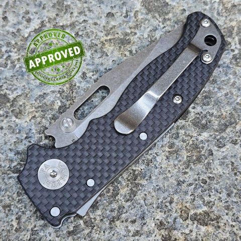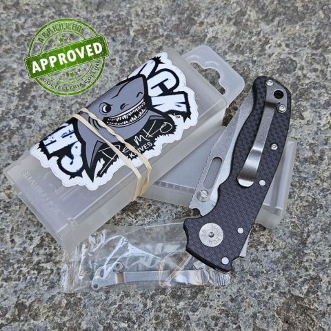 COLTELLO RITIRATO DA COLLEZIONE PRIVATA* Provenienza: Ritirato da un privato, precedentemente acquistato ed utilizzato* Condizioni: Globalmente in buone condizioni, un paio di piccoli segni estetici di uso sulla punta della lama* Reperibile in commercio: Fuori produzione* Affilatura: Di fabbrica* Segni su lama: Un paio di piccoli segni estetici di uso sulla punta della lama* Segni su impugnatura: Nessuno* Scatola: Presente* Fodero: -* Manuali, Certificati e Garanzie: -* Controllato e Certificato dal nostro laboratorio interno Il Demko Knives AD20.5 è un folder di altissima qualità proposto a un prezzo davvero competitivo. Divertente da azionare quanto pratico nell’uso quotidiano, deve gran parte del suo fascino all’innovativo Shark Lock: un sistema radicale che garantisce un blocco sicuro della lama, tenendo sempre le dita al riparo. Il meccanismo si aziona tirando indietro la “pinna” con il pollice o l’indice, con un movimento simile a quello di un flipper opener. Una volta aperta, la