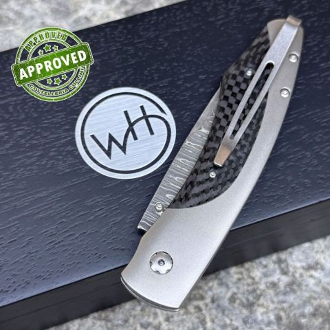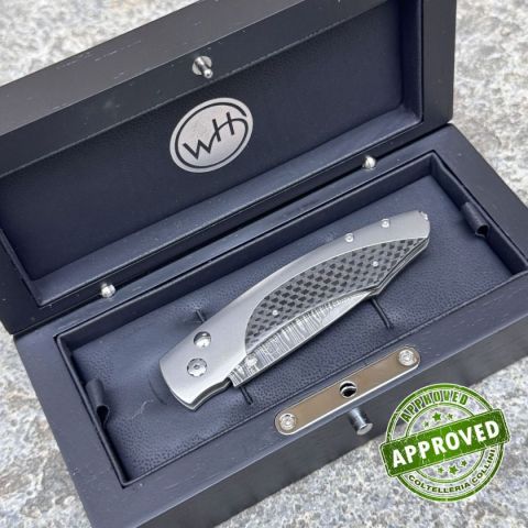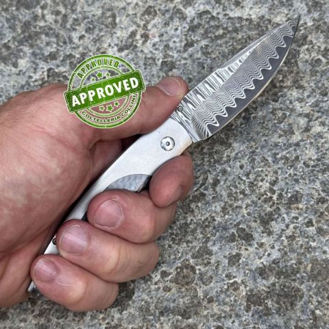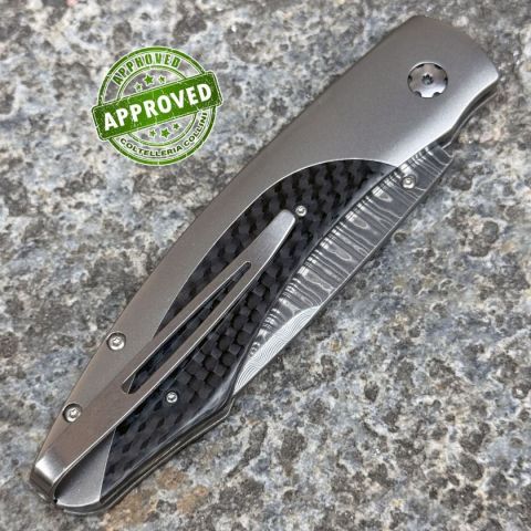 COLTELLO RITIRATO DA COLLEZIONE PRIVATA* Tipologia: Precedentemente acquistato* Condizioni: Pari al nuovo, mai estratto dalla sua confezione originale* Reperibile in commercio: Di difficile reperibilità - Edizione limitata in soli 250 pezzi* Affilatura: Di fabbrica* Segni su lama: Nessuno* Segni su impugnatura: Nessuno* Scatola: Presente* Fodero: Presente* Manuali, Certificati e Garanzie: Presenti* Controllato e Certificato dal nostro laboratorio interno Lo Spearpoint Vega unisce ingegneria di precisione e materiali pregiati in un coltello pieghevole di classe superiore. Il telaio leggero e resistente è realizzato in titanio aerospaziale finemente sabbiato e lucidato, impreziosito da inserti in fibra di carbonio. La lama, in acciaio damasco “Wave” con tagliente in VG-10 ad alta resistenza, offre un taglio versatile. Il sistema di blocco a pulsante ed il thumb stud in acciaio inox permettono un'apertura fluida con una sola mano. Ogni dettaglio esprime la filosofia di William Henry: