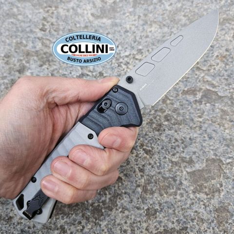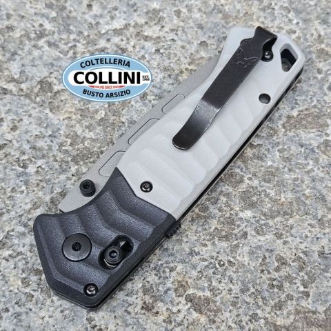Dopo il successo dei modelli di debutto, il nuovissimo 593GY-02 PSK si presenta con un elegante manico in Grivory Storm Gray e rinforzo Grivory Tempest Gray. La lama è in acciaio in polvere Elmax con finitura Gunmetal Gray Cerakote. Progettato intorno al nostro meccanismo AXIS Assist, rapido e affidabile, con sicurezza integrata sul dorso della lama e un choil per acciarino situato nel tallone della lama, il 593GY-02 PSK è il compagno pieghevole ideale, capace di apertura veloce e sicura. Incontra il tuo nuovo kit di sopravvivenza personale, sempre pronto a partire. Destinazione d'uso: Outdoor / BushcraftTipo di produzione: IndustrialePaese di produzione: USALama: in acciaio inox Elmax a 59/61HRCFinitura lama: CerakoteManicatura: Tempest Gray & Storm Gray GryvoryLunghezza lama: 87mm.Spessore lama: 2.8mm.Lunghezza chiuso: 125mm.Lunghezza totale: 213mm.Spessore da chiuso: 15.6mmPeso: 127g.Chiusura: Assis Axis Lock, con fermo di sicurezza in apertura e chiusura tramit