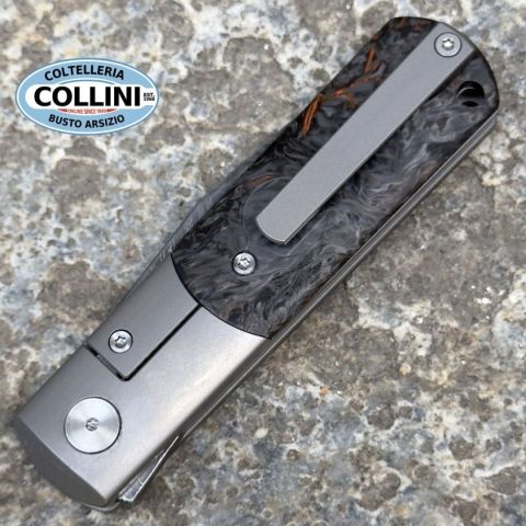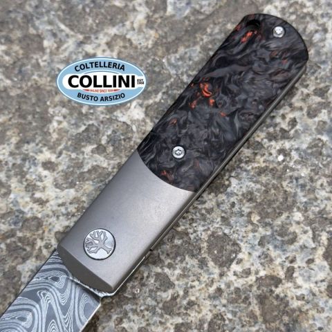 Concetti innovativi, altissima qualità di produzione e una selezione di materiali finemente calibrata: per alcuni il prossimo punto di riferimento, per noi una cosa ovvia. La nostra unità di misura dal 1869: la passione senza filtri per i coltelli affascinanti! Questo è esattamente il caso del Boker Damascus Annual Knife 2024. Ispirato al Boker BRLW, questo sottile coltello da collezione riprende il design del classico Barlow e lo accentua in chiave moderna. Il manico in titanio otticamente sfalsato e fresato con precisione è una caratteristica stilistica che cita il caratteristico bolster extra-lungo nella zona anteriore secondo la vecchia tradizione e lo incornicia con gusto nella zona posteriore del manico con grintose guancette in FatCarbon nel motivo Dark Matter Orange. Un framelock integrato in modo discreto blocca la lama con cuscinetti a sfera e clip point in Damasco a 100 strati, che Chad Nichols ha forgiato a mano nel motivo mozzafiato Black Boomerang. La discreta apertura a