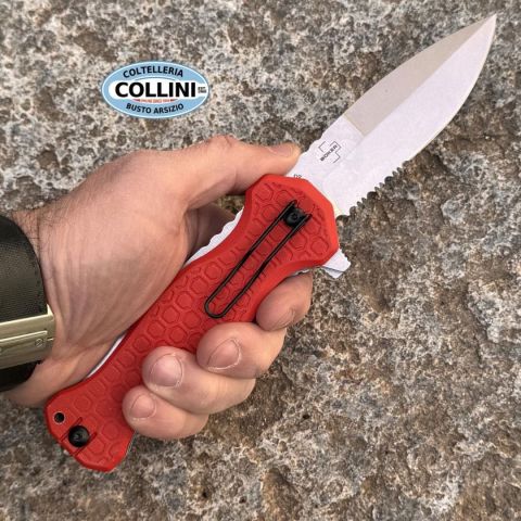 I coltelli realizzati in collaborazione con Dönges sono strumenti specializzati per operazioni di soccorso difficili e impegnative. Ciò che accomuna i prodotti sono le impugnature in in G10 rosso con struttura a nido d'ape Dönges antiscivolo, le lame in acciaio D2 incredibilmente tenaci e performanti ed alla presenza di un frangivetro. Entrambi i coltelli sono dotati di taglienti multipli progettati senza compromessi per tagliare corde, imbracature ed indumenti di persone ferite. L'Expert Fire Folder ha due lame di soccorso che si aprono in direzioni opposte, entrambe bloccate da una chiusura affidabile e resistente allo sporco. Mentre la lama spear point è adatta a compiti di taglio universali, la lama da soccorso è dotata di diverse superfici di taglio polifunzionali. Ha un filo seghettato per le corde e di una punta a leva con estrattore di chiodi integrato. Un tagliacinture si trova direttamente dietro la punta. Infine, la lama multifunzionale è dotata di un apribottiglie per una m
