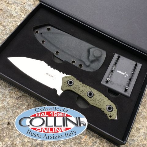 Destinazione d'uso: Tattico / SportivoTipo di produzione: IndustrialePaese di produzione: TaiwanLama: full tang, in acciaio 440CTrattamento lama: stonewashManicatura: in G10 greenLunghezza lama: 100mm.Spessore lama: 5mm.Lunghezza totale: 225mm.Peso: 236g.Fodero: in Kydex, con aggancio tipo Tek-LokConfezione: scatola di cartone con loghi Boker PlusNote: Design by D.J. Urbanovsky