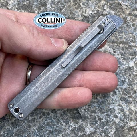 Destinazione d'uso: EDC / Sportivo / collezioneTipo di produzione: IndustrialePaese di produzione: TaiwanLama: in acciaio damasco inox Trattamento lama: satinaturaManicatura: titanioLunghezza lama: 72mm.Spessore lama: 2.1mm.Lunghezza totale: 176mm.Peso: 56g.Clip: amovibile, in titanioChiusura: -Confezione: scatola di cartone con loghi Boker PlusNote: Design by Kansei Matsuno