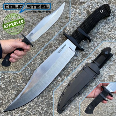 COLTELLO RITIRATO DA COLLEZIONE PRIVATA* Provenienza: Ritirato da un privato, precedentemente acquistato, PRIVO DI SCATOLA* Condizioni: condizioni generali molto buone, mai usato* Reperibile in commercio: attualmente in produzione solo con filo serrated* Affilatura: di fabbrica* Segni su lama: nessuno di particolare* Segni su impugnatura: assenti* Scatola: -* Fodero: in buone condizioni generali, un po' segnato sul lato destro (ved. foto)* Manuali, Certificati e Garanzie: -* Controllato e Certificato dal nostro laboratorio interno Il Cold Steel Marauder Bowie è un'ottima interpretazione di un bowie classico di grandi dimensioni, realizzato con materiali moderni e durevoli. Impiego: Sportivo Tipo di produzione: industrialePaese di Produzione: TaiwanLama: acciaio inox AUS-8AFinitura Lama: satinataManicatura: Kray-Ex kratonLunghezza lama: 228mm.Spessore lama: 4,7mm.Lunghezza totale: 359mm.Bilanciatura: sul ramo di guardiaPeso: 338g. (467g. fodero c