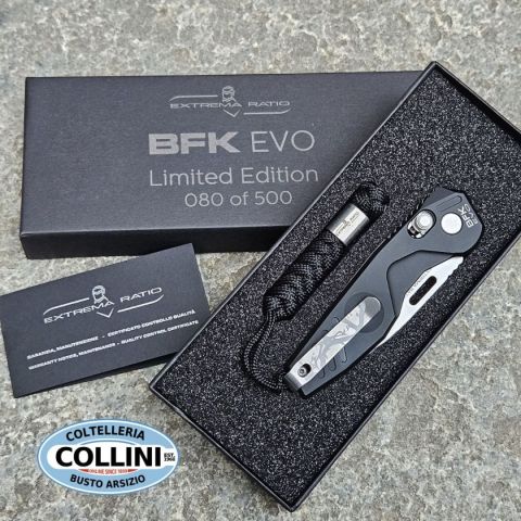 CARRY BOX IN EDIZIONE LIMITATA – BFK EVO Limited EditionIl BFK EVO è un coltello chiudibile compatto concepito come punta di diamante dell’ingresso di Extrema Ratio nel mondo EDC. Realizzato in serie limitata a 500 esemplari, è disponibile esclusivamente all’interno di THE CARRY BOX. La qualità costruttiva Extrema Ratio emerge in ogni dettaglio: precisione meccanica, materiali selezionati, ergonomia collaudata, maneggevolezza, occultabilità, rapidità di apertura e la proverbiale affidabilità che distingue il marchio da oltre 30 anni. Fin dal primo impatto trasmette una sensazione di robustezza e solidità senza compromessi. Caratteristiche principali: * Lama in acciaio Nitrogen con profilo Tanto e punta rinforzata, finitura Stone Washed.* Guancette in alluminio anodizzato Black, robuste e compatte per un porto quotidiano agevole.* Crossbar lock per una sicurezza eccezionale.* Sistema su cuscinetti che garantisce apertura rapida, fluida e naturale.* Lanyard personalizzato sul codolo per