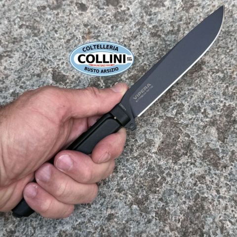 VIPERA nasce dalla fusione tra il mondo tattico e quello survival, combinando rapidità d’impiego, robustezza e precisione in un coltello da meno di 100 grammi. Dotato di una lama drop-point allungata con affilatura full flat a filo stretto, offre penetrazione, taglio fluido e durezza fino a 61 HRC. È disponibile in due acciai ad alte prestazioni, entrambi con eccellente tenuta del filo e resistenza alla corrosione. L’impugnatura ergonomica con guardia integrata assicura massimo controllo in ogni condizione, mentre il fodero in nylon ASPIS ne consente un porto stabile e versatile. VIPERA M390 (Total Black)Si posiziona come strumento specialistico per impieghi tattici e operativi, dove massima durezza, tenuta del filo estrema e penetrazione sono le priorità. L’acciaio M390 (martensitico tradizionale ad alto contenuto di cromo e vanadio) è perfetto per questo: altissima durezza (61 HRC), eccellente tenuta del filo, ma tipicamente più difficile da riaffilare sul campo e meno tenace rispett