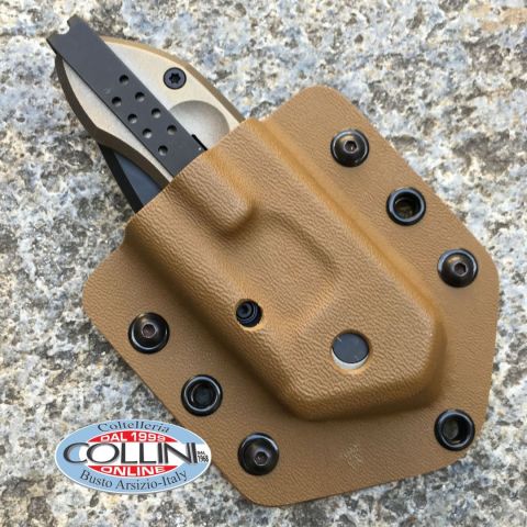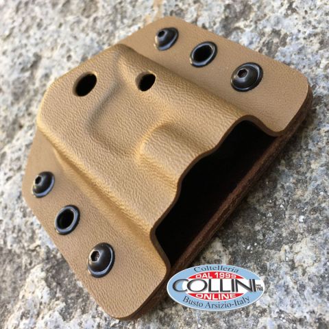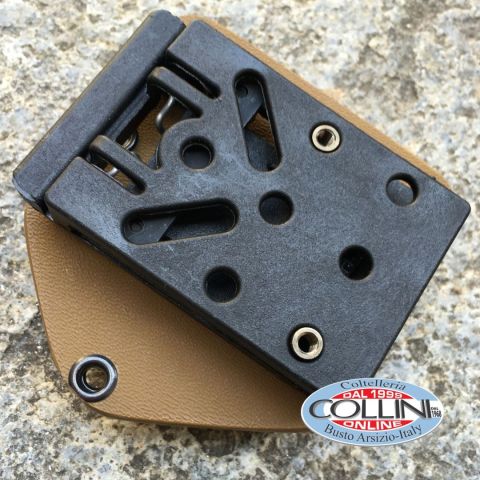 Fodero realizzato artigianalmente su misura per il coltello Extrema Ratio Ti-Rock - materiali: kydex termoformato con all'interno inserto in cuoio - misure: 90 x 80 x 28 mm - colore: kaki - munito di attacco Tek-lok