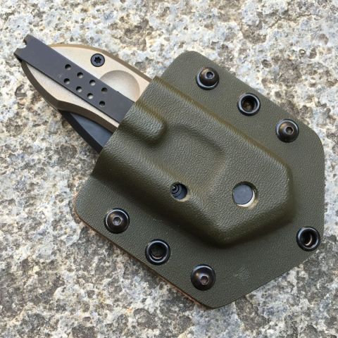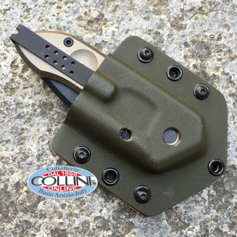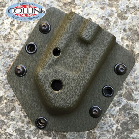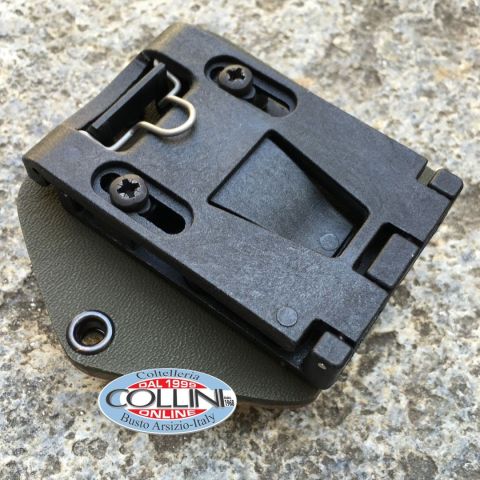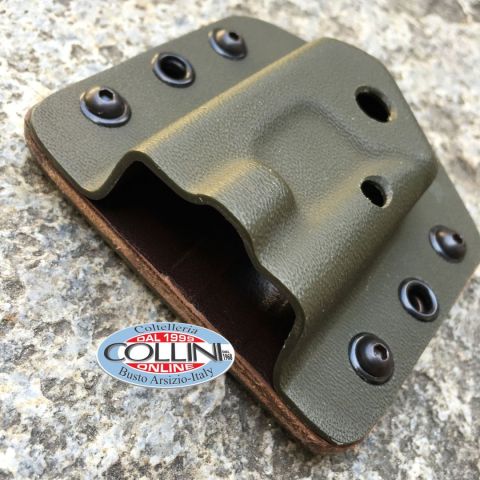 Fodero realizzato artigianalmente su misura per il coltello Extrema Ratio Ti-Rock - materiali: kydex termoformato con all'interno inserto in cuoio - misure: 90 x 80 x 28 mm - colore: verde - munito di attacco Tek-lok