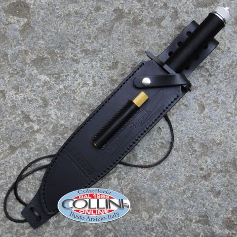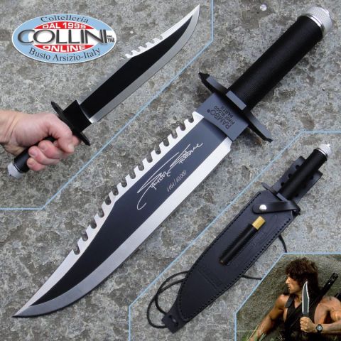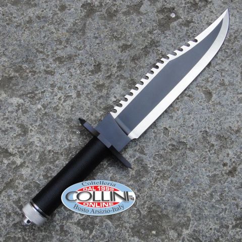 Riproduzione ufficiale dietro licenza cinematografica Hollywood Collectibles del coltello utilizzato nel film di Rambo II First Blood Part 2 Destinazione d'uso: Survival/CollezioneLama: Acciaio Inox 420Manicatura: Alluminio e paracordLunghezza lama: 250mm.Spessore della lama: 5mm.Lunghezza impugnatura: 100mm.Lunghezza totale: 385mm.Bilanciatura: Avanzata, 2cm. dal ramo di guardia inferiorePeso: 505g.Chiusura: -Clip: -Fodero: in cuoioNote: edizione limitata e numerata con firma Sylvester Stallone; bussola con kit di sopravvivenza nel manico, acciaino nel fodero.