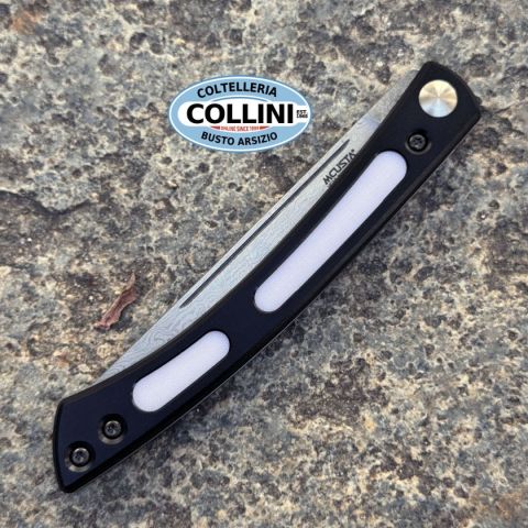 Eleganza Giapponese in Forma Compatta The Executive è un coltello pieghevole che fonde l’estetica tradizionale giapponese con un design moderno ed essenziale. Pensato come un raffinato folding steak knife, è l’accessorio ideale per chi cerca un coltello personale elegante e funzionale. Prodotto a Seki, in Giappone, da Mcusta, questo modello unisce tecnologie moderne e maestria artigianale per offrire una qualità da coltello custom in una produzione di serie. La lama in damasco con anima in acciaio VG-10 garantisce prestazioni eccellenti, mentre le guancette in alluminio anodizzato nero con inserti in micarta bianca donano un tocco di classe.Il meccanismo slipjoint innovativo offre una resistenza progressiva con fermo a lama chiusa, a metà corsa e completamente aperta. Lungo 11,6 cm da chiuso, leggero e sottile, viene fornito con elegante astuccio da tasca in pelle nera. Destinazione d'uso: bistecca / cibo / sportivoTipo di produzione: MidTechPaese di produzione: GiapponeLama: in