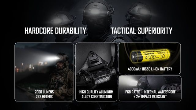La Nitecore HC65M UHE è la versione “M” della serie HC65 UHE, progettata per il montaggio rapido su caschi con staffa NVG. Combina un’ottica a matrice con LED UHE ad altissima efficienza per erogare fino a 2.000 lumen, con tre uscite di luce (bianca primaria, bianca ausiliaria ad alto CRI e rossa) e modalità SOS/Beacon per emergenza. Alimentata da batteria Li-ion 18650 4.000 mAh ricaricabile via USB-C, offre un’eccellente autonomia e un corpo full-metal robusto con protezione IP68 e resistenza agli impatti fino a 2 metri. Montaggio NVG: staffa dedicata per caschi con attacco NVG (versione “M”). Potenza: fino a 2.000 lumen (LED UHE ad altissima efficienza). Tripla uscita: luce bianca primaria (circa 6.000 K), bianca ausiliaria high CRI (CRI ≥ 90) e luce rossa. Ricarica rapida USB-C con indicatore livello batteria e funzione lockout. Autonomia estesa: fino a ~82 ore nelle modalità più basse. Robustezza: grado di protezione IP68 e resistenza alle ca