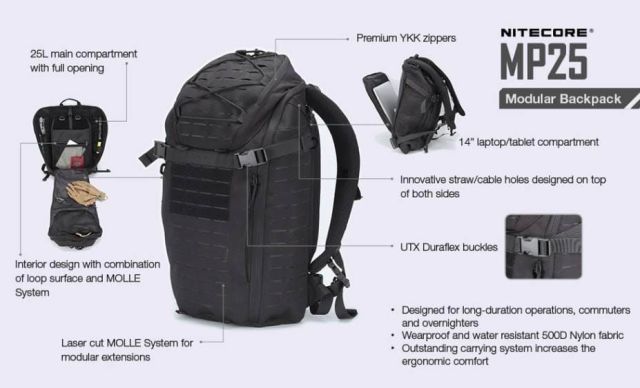 Nell'ultimo anno Nitecore ha potenziato lo sviluppo e la produzuione di prodotti rivolti al settore militare / forze dell'ordine, appoggiandosi a professionisti del settore e creando un team dedicato solo per servire questo mercato. Nitecore ha lanciato i primi prototipi nel mese di aprile del 2019 e quasi un anno dopo è finalmente arrivata sul mercato con 3 diverse dimensioni di zaini tattici, 20L, 25L e 30L. Grazie all'innovativo sistema MOLLE interno ed esterno tagliato a laser, gli zaini Nitecore permettono una personalizzazione illimitata e ne permettono il funzionamento con qualsiasi tasca a MOLLE oggi sul mercato. Le cinghie tagliate al laser riducono inoltre anche il peso dello zaino, migliorandone il confort e la trasportabilità. Modello: MP25Tipo: zaino modulareCapacità: 25LDimensioni: 50 x 27 x 17 cmVano ausiliario: adatto per laptop / tablet da 14 "Peso: 1,5 kgColori disponibili: nero Caratteristiche tecniche - Cerniere YKK premium- Innovativi for