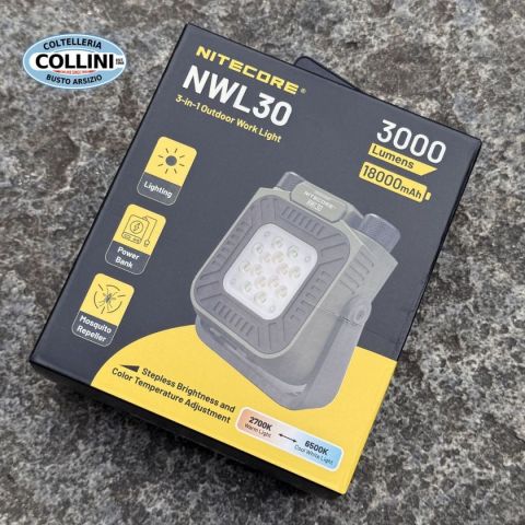 Luce, potenza e protezione: tutto in un unico dispositivo.Il NITECORE NWL30 è la nuova luce da lavoro outdoor 3-in-1 progettata per offrire illuminazione ad alte prestazioni, funzione antizanzare e power bank integrato. Ideale per attività outdoor, manutenzione, emergenze e campeggio. Caratteristiche principali 3 funzioni integrate: luce, repellente per zanzare, power bank Emissione luminosa fino a 3.000 lumen con portata massima di 120 metri Autonomia fino a 130 ore con batteria integrata da 18.000mAh Regolazione continua di luminosità (50-3000lm) e temperatura colore (2700K-6500K) Rotella doppia per controllo fluido di luce e colore Base magnetica con forza di tenuta fino a 22N (≥3400Gs) e rotazione a 360° Foro filettato da 1/4" per montaggio su treppiedi Ricarica rapida USB-C 20W, tempo di ricarica completa: 3,6 ore Modalità luce rossa per visione notturna e segnalazioni d’emergenza 2 modalità antizanzare (copertura 3,5 m e 5 m) Utilizzabile come power bank d’emergenza con uscita US