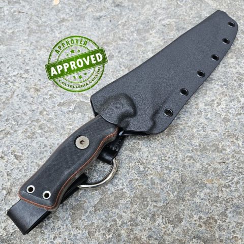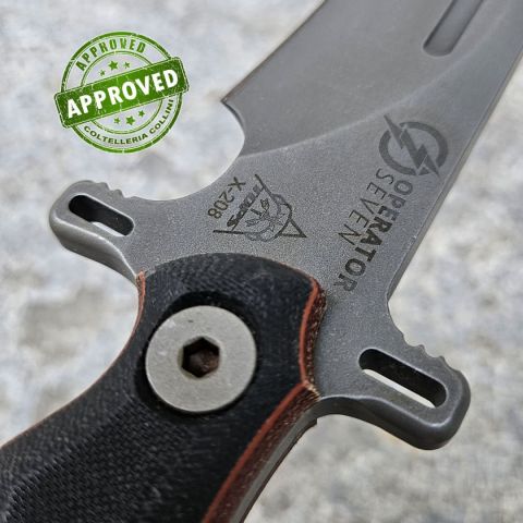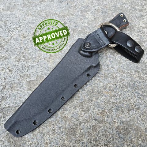 COLTELLO RITIRATO DA COLLEZIONE PRIVATA* Provenienza: Ritirato da un privato, precedentemente acquistato* Condizioni: Globalmente in ottime condizioni* Reperibile in commercio: Fuori produzione, reperibile in differenti finiture e configurazioni* Affilatura: Di fabbrica* Segni su lama: Nessuno* Segni su impugnatura: Nessuno* Scatola: -* Fodero: Presente* Manuali, Certificati e Garanzie: -* Controllato e Certificato dal nostro laboratorio interno Il modello Operator 7 è enorme! TOPS Knives ha osato con un coltello imponente, con lama spessa e manico massiccio, creando uno strumento bilanciato che eccelle come vero e proprio “workhorse”. Allo stesso tempo, mantiene quell’estetica classica da coltello da combattimento americano, apparendo tanto spettacolare quanto performante. Realizzato in acciaio 1075 spesso 8 mm, la lama è trattata termicamente in modo differenziale: il filo è resistente agli urti, mentre il dorso è incredibilmente robusto. Il manico combina Micarta color sabbia nella
