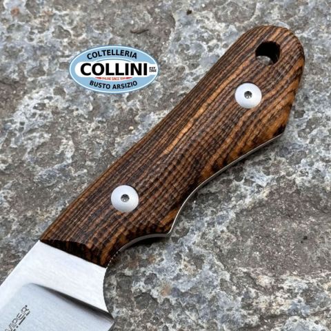 Il Viper Handy è un coltello fisso innovativo e compatto, progettato per offrire un'esperienza d'uso ottimale grazie all'impiego di tecnologie di produzione avanzate e materiali di alta qualità. Ideato dal maestro Fabrizio Silvestrelli, questo coltello si distingue per la sua leggerezza ed ergonomia, garantendo una maneggevolezza eccezionale e un utilizzo confortevole anche durante sessioni prolungate. Il Viper Handy, con la sua lama fissa in acciaio CPM MagnaCut, offre un'elevata resistenza e una durata eccezionale. La finitura satinata aggiunge un tocco di eleganza. L'impugnatura in canvas micarta naturale, lavorata in 3D, si adatta perfettamente alla mano, garantendo una presa sicura e precisa. Il codolo del manico, assottigliato verso il retro, favorisce un bilanciamento ottimale del coltello, riducendo l'affaticamento durante l'utilizzo prolungato. Questo rende il Viper Handy ideale per attività outdoor e di caccia, nonché per operazioni tattiche dove la precisione e la resistenza