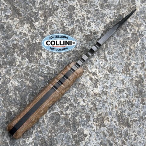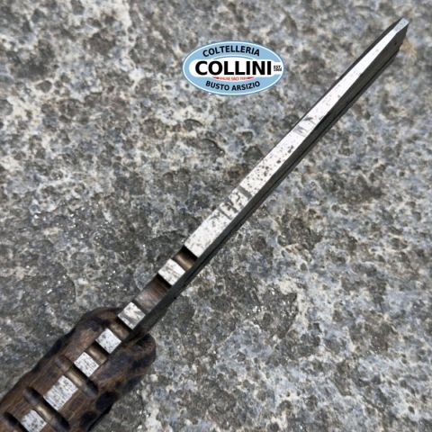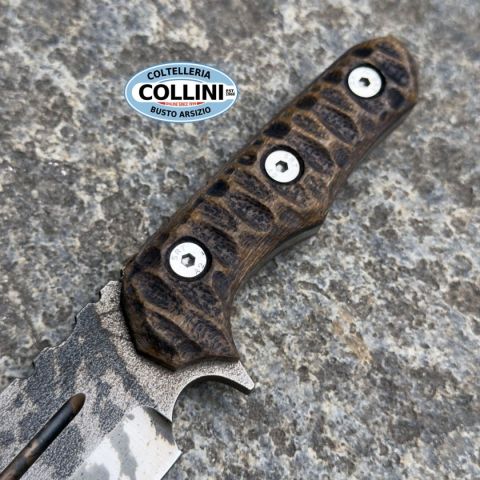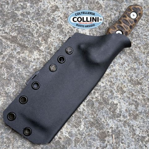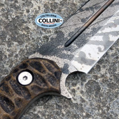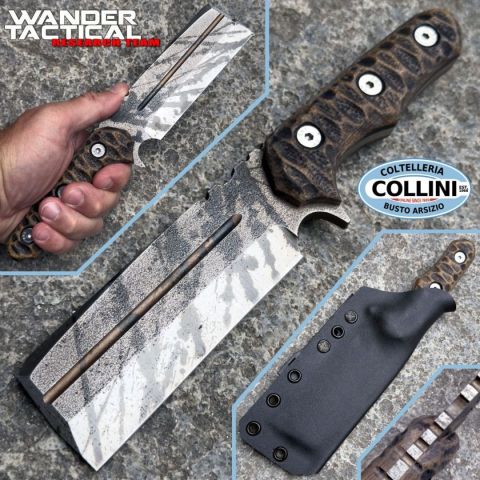 Il Wander Tactical "Cleaver" è un coltello a lama fissa progettato per tagli chirurgici e di precisione grazie alla sua affilatura concava che garantisce prestazioni estreme. Con una lama di 10cm in acciaio D2, noto per la sua eccellente ritenzione del filo e resistenza all'usura, questo coltello è pensato per durare nel tempo e resistere alle condizioni più difficili. Ciò che rende questo modello particolarmente speciale è che rientra nelle versioni interamente custom sia per il coltello che per il fodero. La lama è realizzata su misura, con dettagli personalizzati secondo l'estro dell'artigiano Dino Picco. Il manico, realizzato in legno di Zebrano assicura una presa salda e confortevole e risulta estremamente ergonomico. Il fodero in cuoio, anch'esso realizzato a mano da Dino, è progettato per essere funzionale e resistente con un look retro. Impiego: Heavy Duty / Collezione Tipo di produzione: ArtigianalePaese di produzione: ItaliaLama: in acciaio D2 a 59/60HRCFinitura lama: Black B