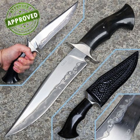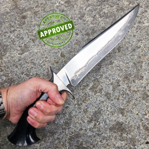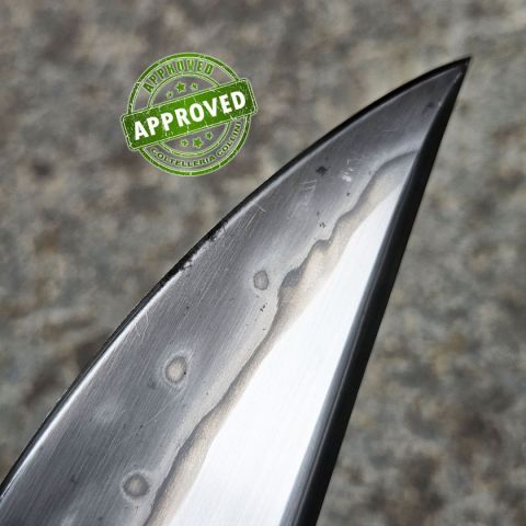 COLTELLO RITIRATO DA COLLEZIONE PRIVATA* Provenienza: Ritirato da un privato, precedentemente acquistato* Condizioni: Mai utilizzato, mai estratto dal fodero, mai esposto; trattandosi di una lama in carbonio e restando a lungo nel fodero ha purtroppo sviluppato piccoli punti di ossidazione sulla lama facilmente rimovibili con una potenziale riaffilatura, non è possibile invece intervenire sulle ossidazioni presenti sull'ossidazione passivante dell'hamon. Il prezzo a cui viene proposto tiene conto di questi dettagli estetici che non ne compromettono in nessun modo il potenziale utilizzo concreto.* Reperibile in commercio: pezzo unico, interamente realizzato a mano* Affilatura: Di fabbrica* Segni su lama: piccoli punti di ossidazione, alcuni potenzialmente rimuovibili (quelli presenti sul filo e sulla punta della lama)* Segni su impugnatura: Nessuno* Scatola: Venduto con astuccio in velluto bordeaux* Fodero: Pari al nuovo, mai utilizzato e mai indo