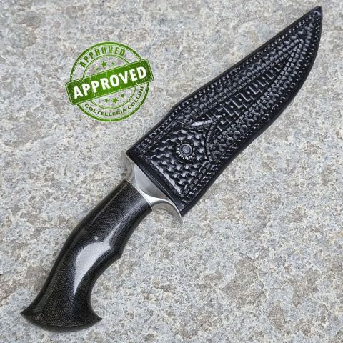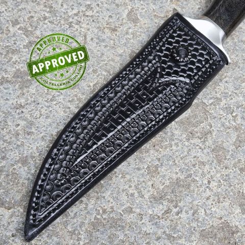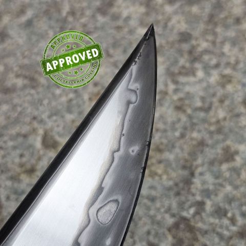 COLTELLO RITIRATO DA COLLEZIONE PRIVATA* Provenienza: Ritirato da un privato, precedentemente acquistato* Condizioni: Mai utilizzato, mai estratto dal fodero, mai esposto; trattandosi di una lama in carbonio e restando a lungo nel fodero ha purtroppo sviluppato piccoli punti di ossidazione sulla lama facilmente rimovibili con una potenziale riaffilatura, non è possibile invece intervenire sulle ossidazioni presenti sull'ossidazione passivante dell'hamon. Il prezzo a cui viene proposto tiene conto di questi dettagli estetici che non ne compromettono in nessun modo il potenziale utilizzo concreto.* Reperibile in commercio: pezzo unico, interamente realizzato a mano* Affilatura: Di fabbrica* Segni su lama: piccoli punti di ossidazione, alcuni potenzialmente rimuovibili (quelli presenti sul filo e sulla punta della lama)* Segni su impugnatura: Nessuno* Scatola: Venduto con astuccio in velluto bordeaux* Fodero: Pari al nuovo, mai utilizzato e mai indo