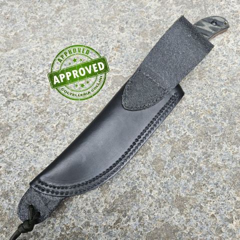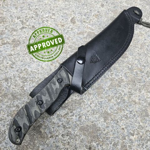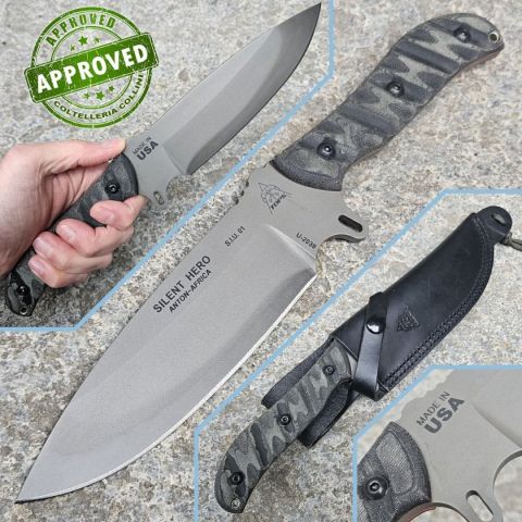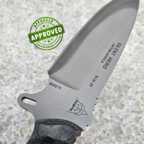 COLTELLO RITIRATO DA COLLEZIONE PRIVATA* Provenienza: ritirato da un privato, precedentemente acquistato* Condizioni: buone, non utilizzato* Reperibile in commercio: ancora reperibile, in un'altra versione* Affilatura: di fabbrica, in ottimo stato* Segni su lama: qualcuno, in prossimità della manicatura, probabilmente dovuti a sfregamento contro il fodero* Segni su impugnatura: nessuno* Scatola: non presente, come per la maggior parte dei modelli Tops* Fodero: presente, taglio superficiale (ved. foto) vicino al bottone automatico* Manuali, Certificati e Garanzie: -* Controllato e Certificato dal nostro laboratorio interno Il Silent Hero è stato progettato da Anton Du Plessis, all'epoca capo delle operazioni dell'unità speciale di interdizione della Silent Heroes Foundation. Il suo compito era quello di combattere il bracconaggio in Sudafrica. Questo coltello doveva essere resistente, versatile e in grado di soddisfare le esigenze di Anton sul campo, il che ha influito sul design della