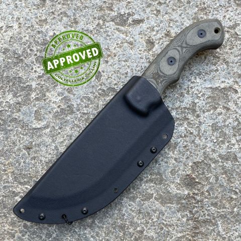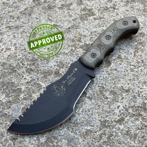 COLTELLO RITIRATO DA COLLEZIONE PRIVATA* Provenienza: ritirato da un privato, precedentemente acquistato* Condizioni: buone, poco utilizzato e non in modo pesante* Reperibile in commercio: ancora reperibile, anche se con una diversa manicatura* Affilatura: di fabbrica, poco usurata* Segni su lama: nessuno sulla parte trattata, qualche punto di ossidazione sul filo* Segni su impugnatura: nessuno* Scatola: non presente, come per la maggior parte dei modelli Tops* Fodero: presente, con segni si sfregamento sul Kydex e ossidazione sulle clip in metallo* Manuali, Certificati e Garanzie: -* Controllato e Certificato dal nostro laboratorio interno Il Tops Tom Brown Tracker è un coltello da molti anni apprezzato dagli appassionati di sopravvivenza e progettato per affrontare ogni situazione outdoor. Caratterizzato da una lama full tang con profilo distintivo multi-sezione — ideale per tagliare, intagliare, spaccare e scuoiare — offre una versatilità eccezionale. Realizzato in acciaio al carbon