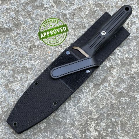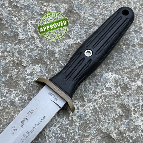COLTELLO RITIRATO DA COLLEZIONE PRIVATA* Tipologia: Precedentemente acquistato* Condizioni: Globalmente in buone condizioni* Reperibile in commercio: Fuori produzione* Affilatura: Ripristinata professionalmente* Segni su lama: leggeri* Segni su impugnatura: /* Scatola: non presente* Fodero: Originale, in Nylon, in ottime condizioni* Manuali, Certificati e Garanzie: non presenti* Controllato e Certificato dal nostro laboratorio interno Il design di questo mitico coltello nacque dall’incontro fra un’ex militare e guardia corpo del presidente Roosevelt, Rex Applegate, e William Ewart Fairbairn, che insieme a Edward Anthony Sykes, aveva dato vita al capostipite dei fighter militari moderni: il Fairbairn-Sykes che accompagnò i Commando inglesi durante la seconda guerra mondiale. Per definire le forme del nuovo coltello i due partirono proprio dai limiti emersi dall’impiego bellico del Fairbairn-Sykes, in particolare fragilità, limitata