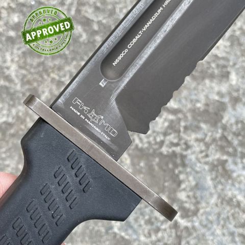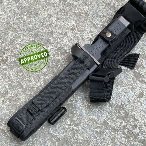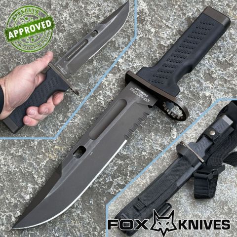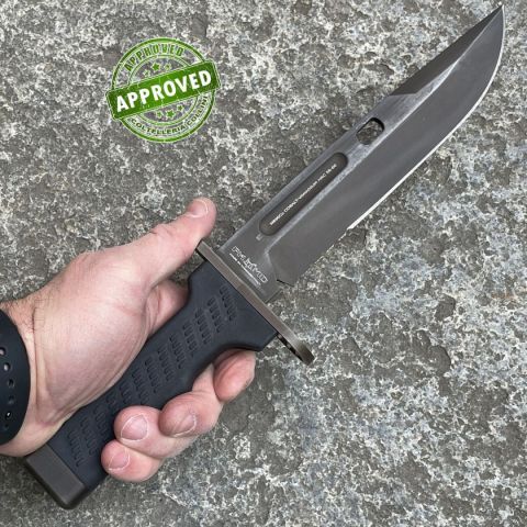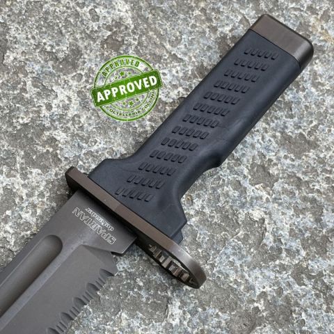 COLTELLO RITIRATO DA COLLEZIONE PRIVATA* Tipologia: coltello del 2014 precedentemente acquistato ed utilizzato* Condizioni: Globalmente in buone condizioni* Reperibile in commercio Fuori produzione* Affilatura: Riaffilato professionalmente* Segni su lama: Leggeri segni superficiali di sfregamento sulla finitura opaca* Segni su impugnatura: Piccoli segni superficiali su pomolo e guardia* Scatola: Non presente* Fodero: Presente, originale, in fibra di vetro, nylon e cordura con taglia fili in acciaio inox* Manuali, Certificati e Garanzie: Non presenti* Controllato e Certificato dal nostro laboratorio interno Coltello lanciato sul mercato nel 2014 da Fox Knives, versione civile della loro Baionetta Militare Spartan Defender. Ha la particolarità di avere un'impugnatura trapezoidale in polimeri con lama disassata verso l'alto rispetto alla presa dell'utilizzatore. Modello ormai fuori produzione e sostituito dalla "Spartan 2 Leonida" attualmente in produzione, decisamente più canonica nell'a
