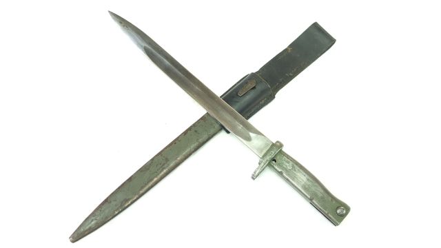 BAIONETTA TEDESCA ERSATZ PER GEW88/98. FINITURA ORIGINALE FELD-GRAU (UNA VERNICE CHE ERA SUL FODERO E IMPUGANTURA). CONDIZIONI PIU’ CHE BUONE. LUNGHEZZA LAMA 32CM.
