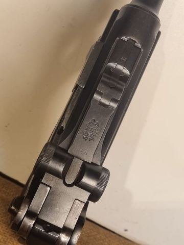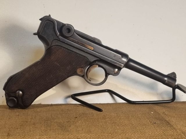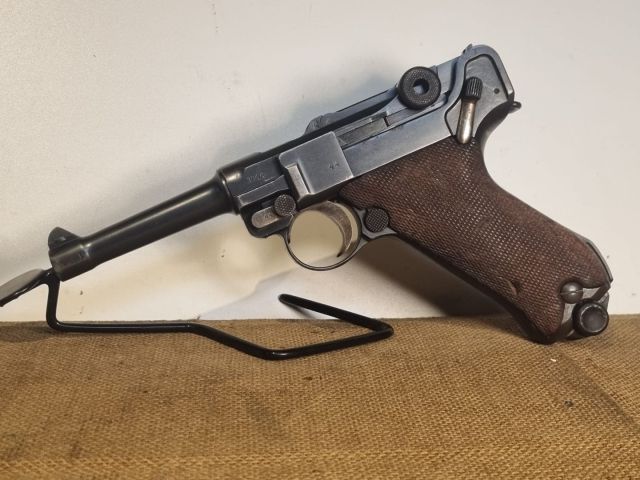 PISTOLA SPORTIVA CAL. 9X19, MONOMATRICOLA TRANNE CARICATORE E GUANCETTE, OLTRE 90% DI BRUNITURA ORIGINALE, MARCHI MILITARI IMPERIALI, CULATTA SENZA DATA. ARMA PROBABILMENTE ASSEMBLATA NEL 1919 NELLE MORE DEL TRATTATO VERSAILLES. DOPO IL 1920 SONO INFATTI STATE TUTTE DATATE, LE ULTIME MILITARI PRECEDENTI SI FERMANO AL 1918. CANNA IN CONDIZIONI PERFETTE