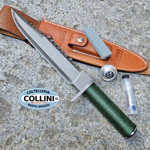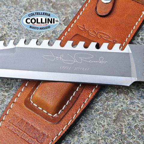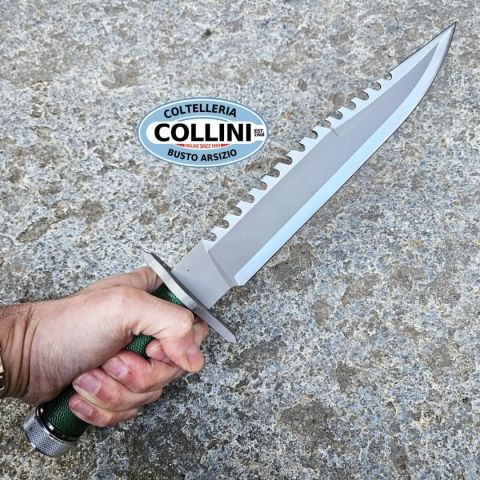 Il coltello di Rambo: First Blood, primo capitolo della serie, rappresenta uno dei più celebri esempi di coltello da sopravvivenza moderno. Progettato dal maestro coltellinaio Jimmy Lile su specifica richiesta di Sylvester Stallone, non fu pensato come semplice oggetto di scena, ma come uno strumento reale, funzionante e utile in un contesto di sopravvivenza estrema. Nel film, John Rambo è un ex berretto verde reduce dal Vietnam, esperto di tecniche di guerriglia e adattamento all’ambiente. Il coltello diventa il simbolo della sua autosufficienza: lama robusta, dorso seghettato per tagliare legno e metallo sottile, manico cavo con guarnizione impermeabile per contenere un piccolo kit di emergenza (fiammiferi, spago, ami), e un pomo piatto utilizzabile come martello o battente. Sul fodero era inoltre integrata una pietra per affilare, evidenziando la filosofia del “non dipendere da nient’altro che da ciò che porti con te”. Il design del coltello di Rambo 1 anticipa il mito dell’eroe sol
