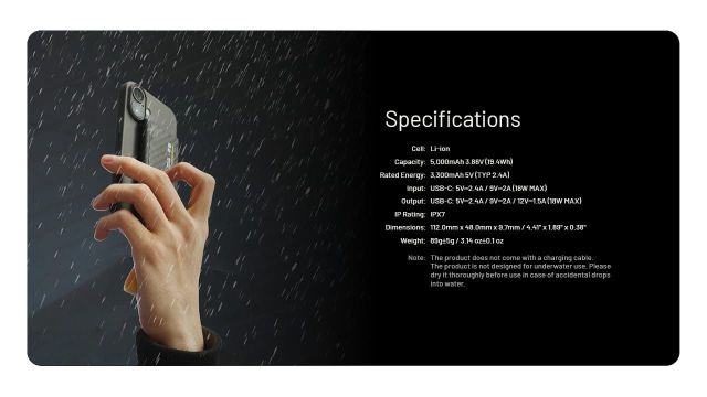 NB Air è una batteria portatile ad alte prestazioni, compatta e leggera, ideale per garantire una ricarica affidabile in ogni situazione.Grazie al suo design sottile e all'impermeabilità certificata IPX7, offre protezione contro polvere, schizzi d'acqua ed immersione temporanea rendendola perfetta per un utilizzo quotidiano e outdoor.DATI TECNICIBatteria: Li-ionCapacità: 5.000mAh 3,88V (19,4Wh)Energia Nominale: 3.300mAh 5V (TYP 2,4A)Ingresso: USB-C: 5V⎓2,4A / 9V⎓2A (18W MAX)Uscita: USB-C: 5V⎓2,4A / 9V⎓2A / 12V⎓1,5A (18W MAX)Grado di Protezione: IPX7Dimensioni: 112,0mm x 48,0mm x 9,7mm / 4,41" x 1,89" x 0,38"Peso: 89g±5g / 3,14 oz±0,1 ozNota: Il prodotto non include un cavo di ricarica e non è compatibile con sistemi di ricarica magnetici e ad induzione